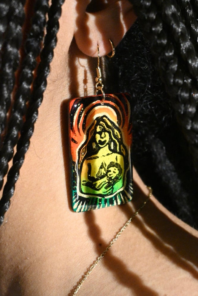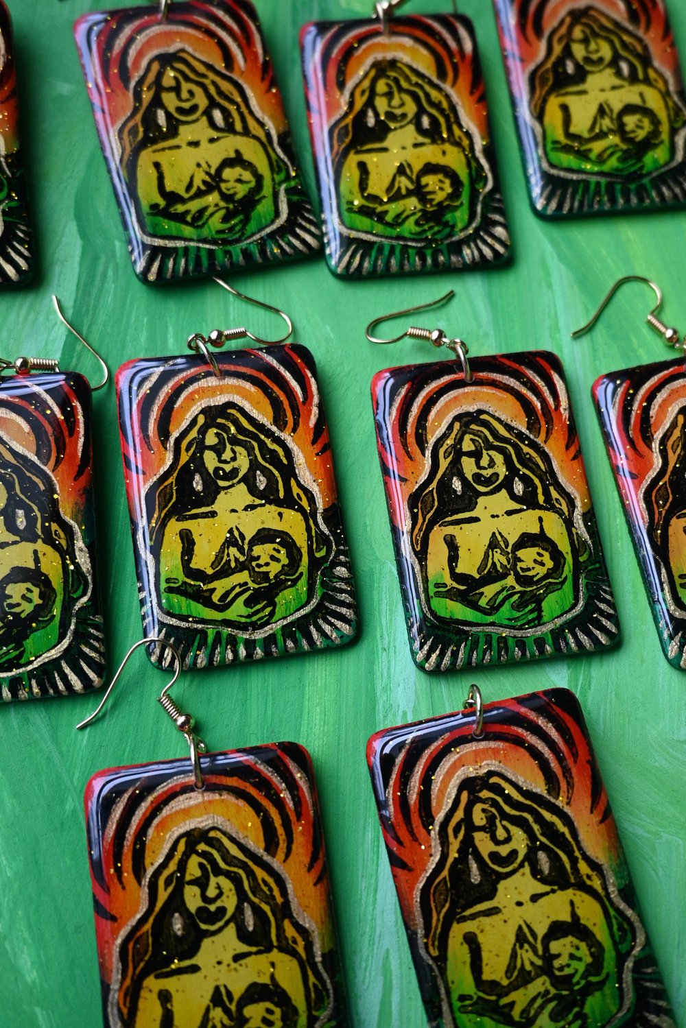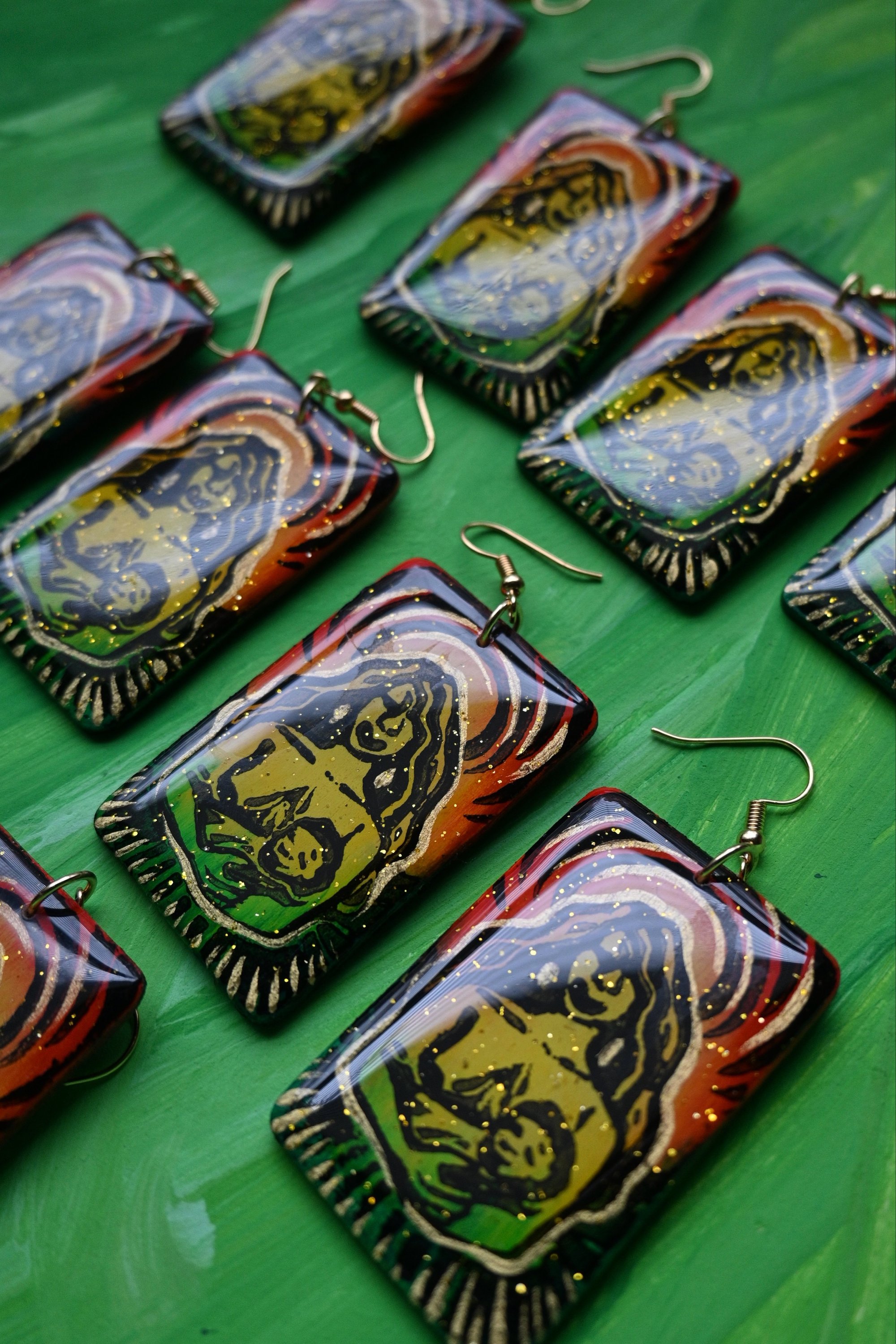 Linoleum block printed earrings. Embellished with iridescent gold paint and subtle gold glitter. Coated in crystal clear resin. 18k gold-plated hardware.