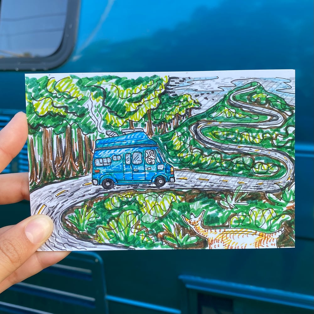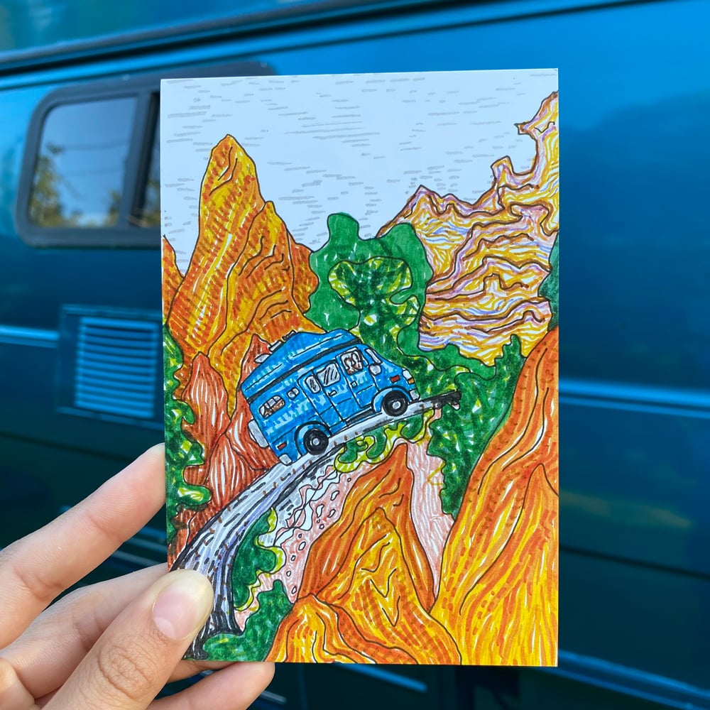 4- 4x6 postcard prints of marker drawings I did in my sketchbook while out on the road. All postcards have a handwritten message and are signed on the back. Images are inspired by Cloudland Canyon, Georgia, all of Kansas, Garden of the Gods and Indian Peaks Wilderness (both in Colorado).